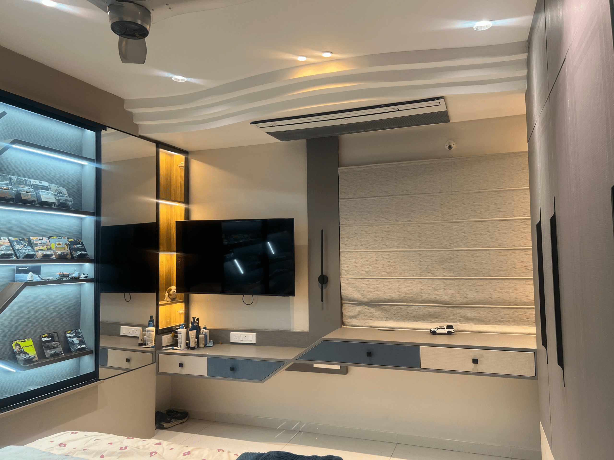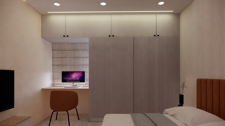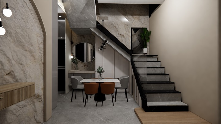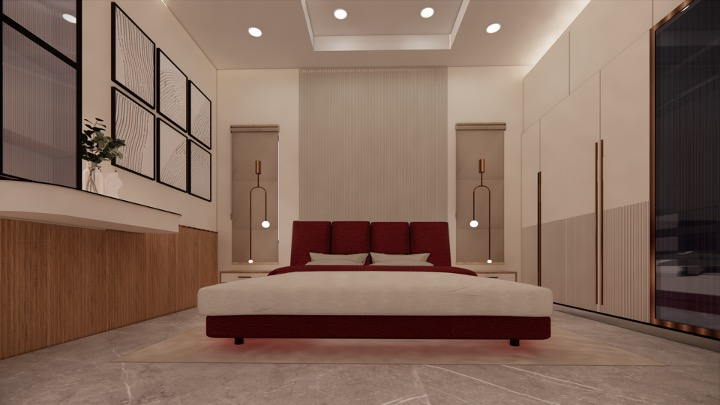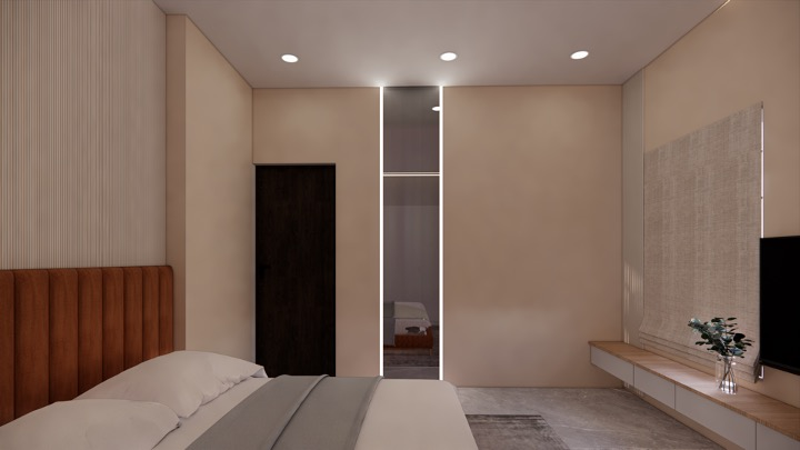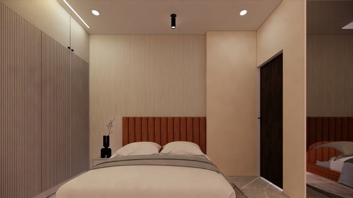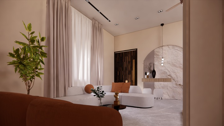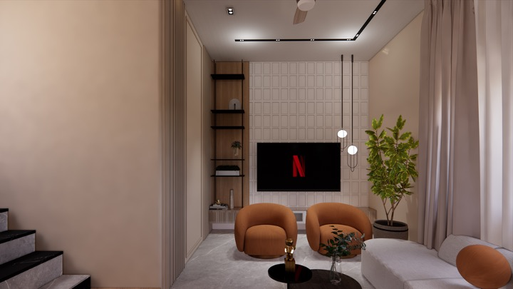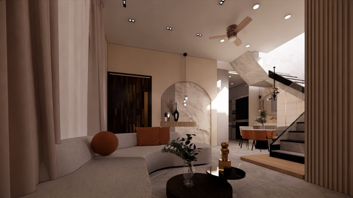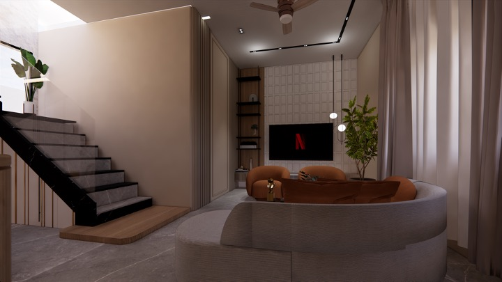 The interiors are defined by a minimalist design language enhanced with elegant detailing. Every element—from furniture and finishes to lighting and spatial planning—has been curated to maintain harmony while adding depth and character. The living areas are designed to be inviting and versatile, while the private zones offer a calm and relaxing retreat.