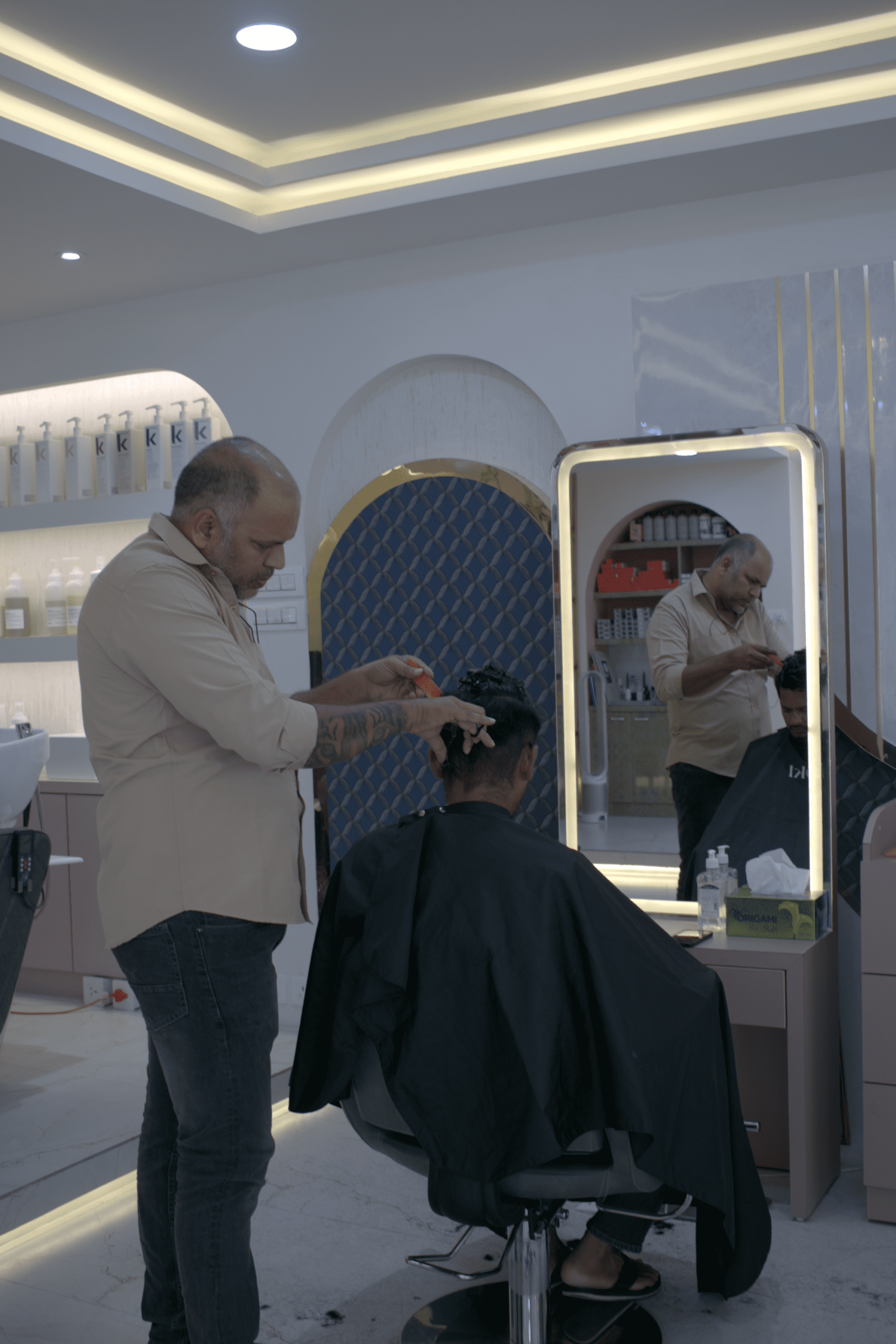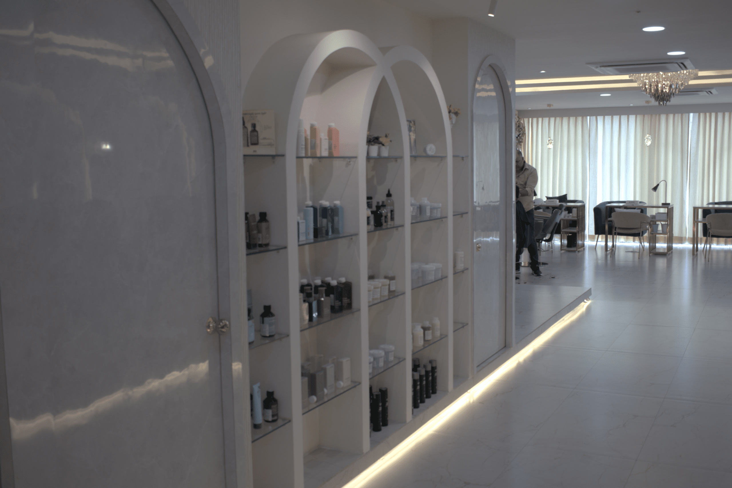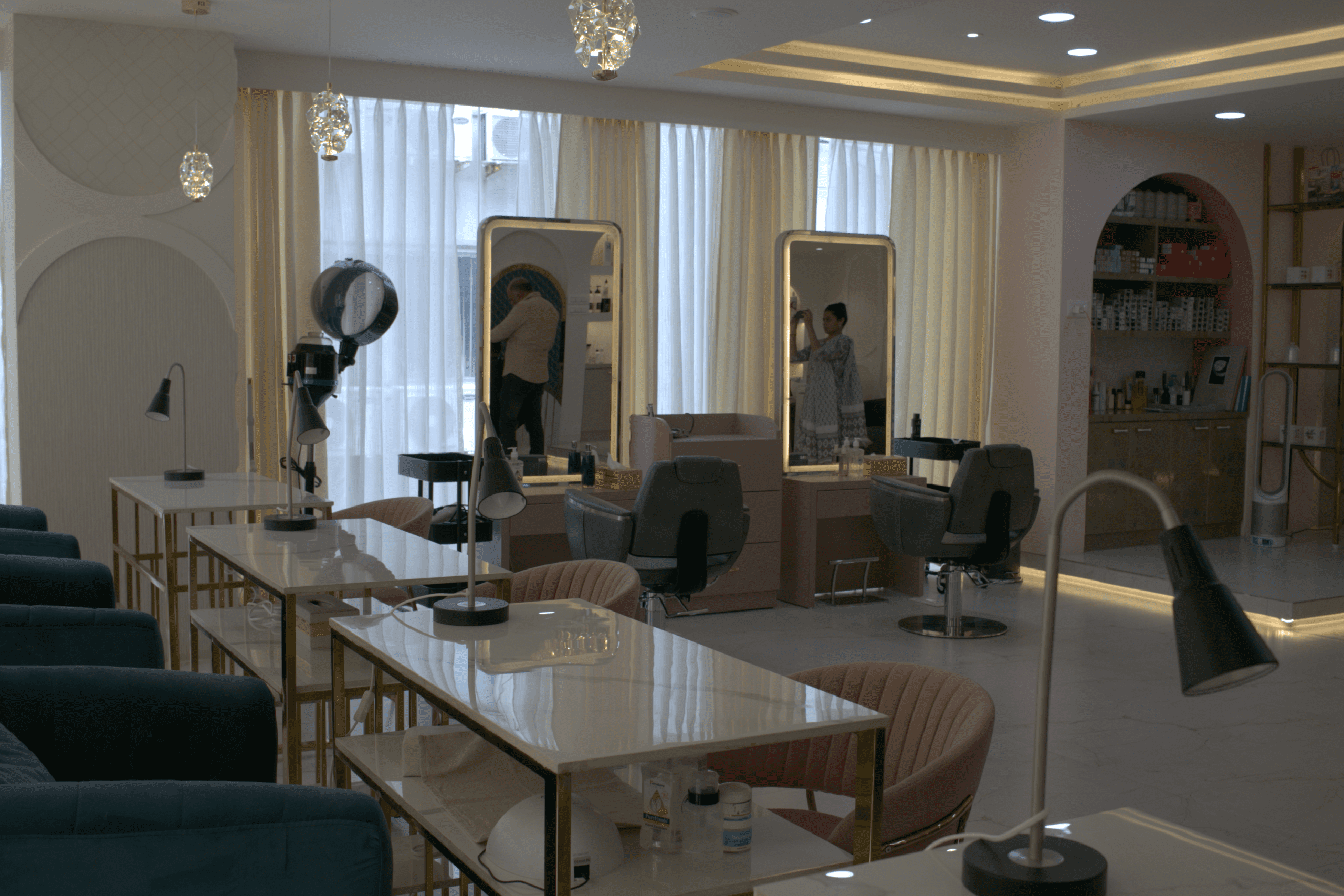 Lighting played a crucial role in enhancing the overall ambiance of the space. A combination of ambient, accent, and task lighting was used to highlight the architectural details and create a warm, inviting atmosphere. Carefully placed mirrors and reflective surfaces further amplify the sense of space and elegance, making the salon feel open, bright, and luxurious.