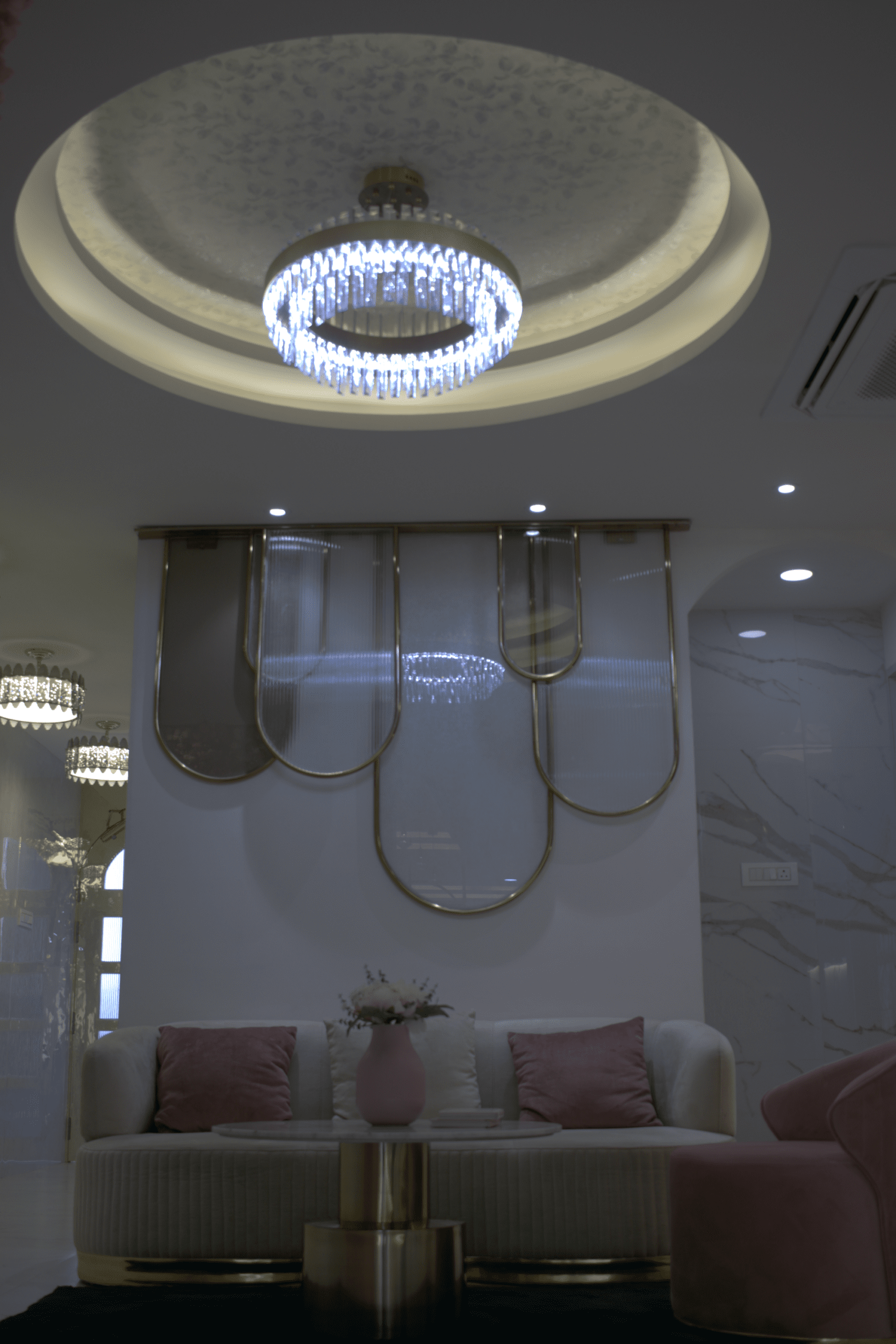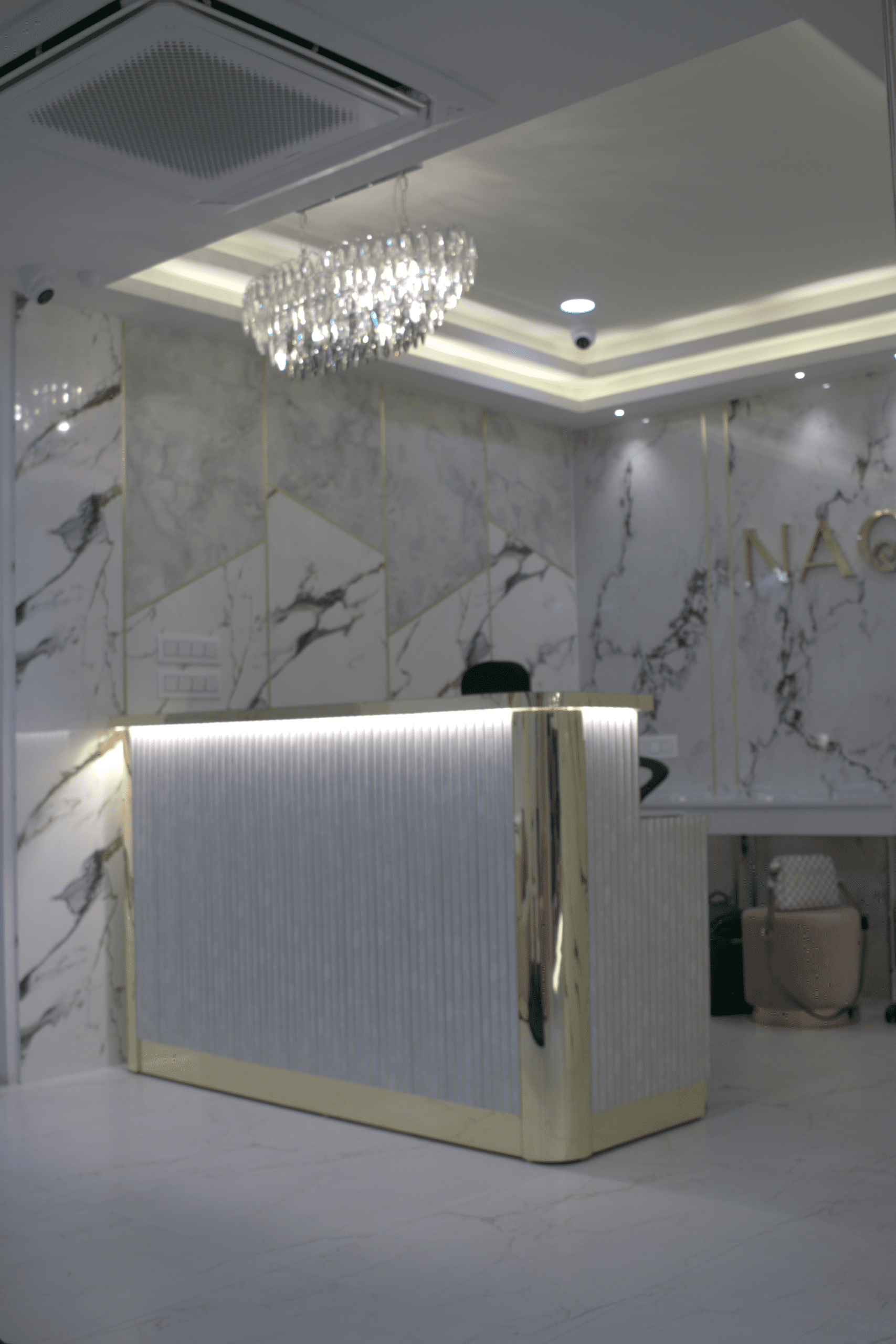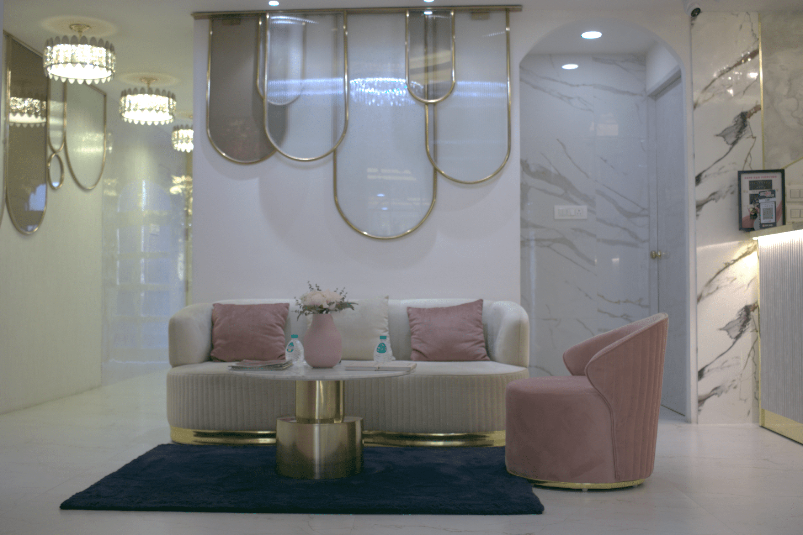 Lighting played a crucial role in enhancing the overall ambiance of the space. A combination of ambient, accent, and task lighting was used to highlight the architectural details and create a warm, inviting atmosphere. Carefully placed mirrors and reflective surfaces further amplify the sense of space and elegance, making the salon feel open, bright, and luxurious.