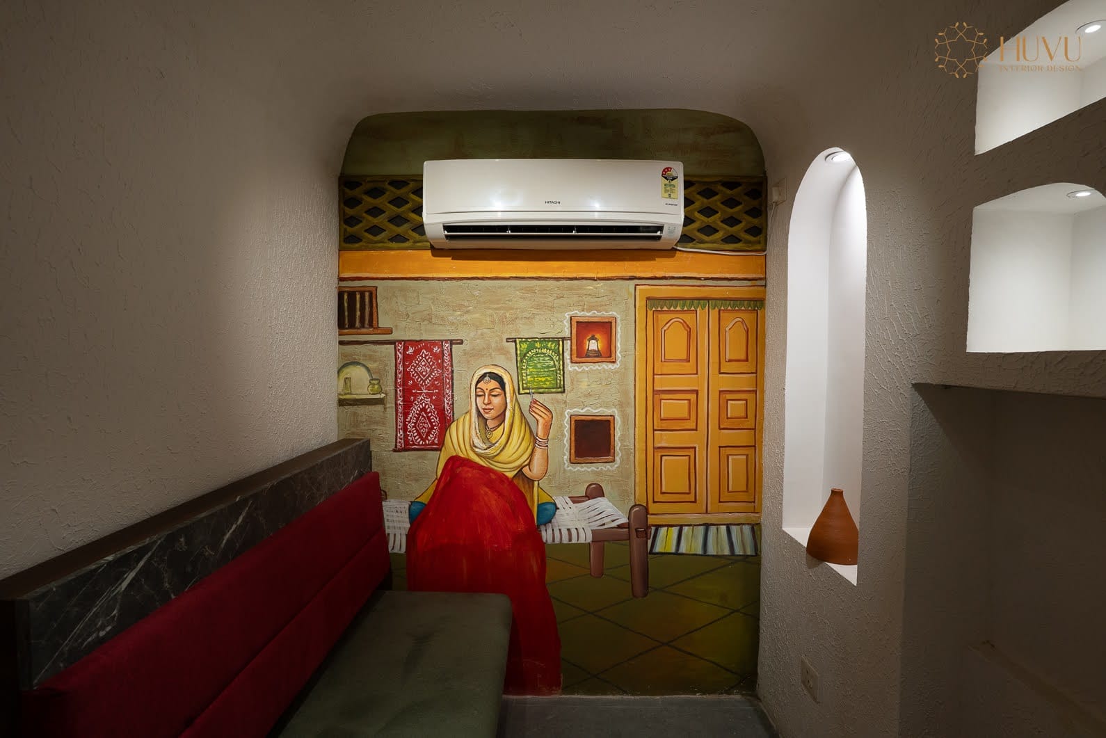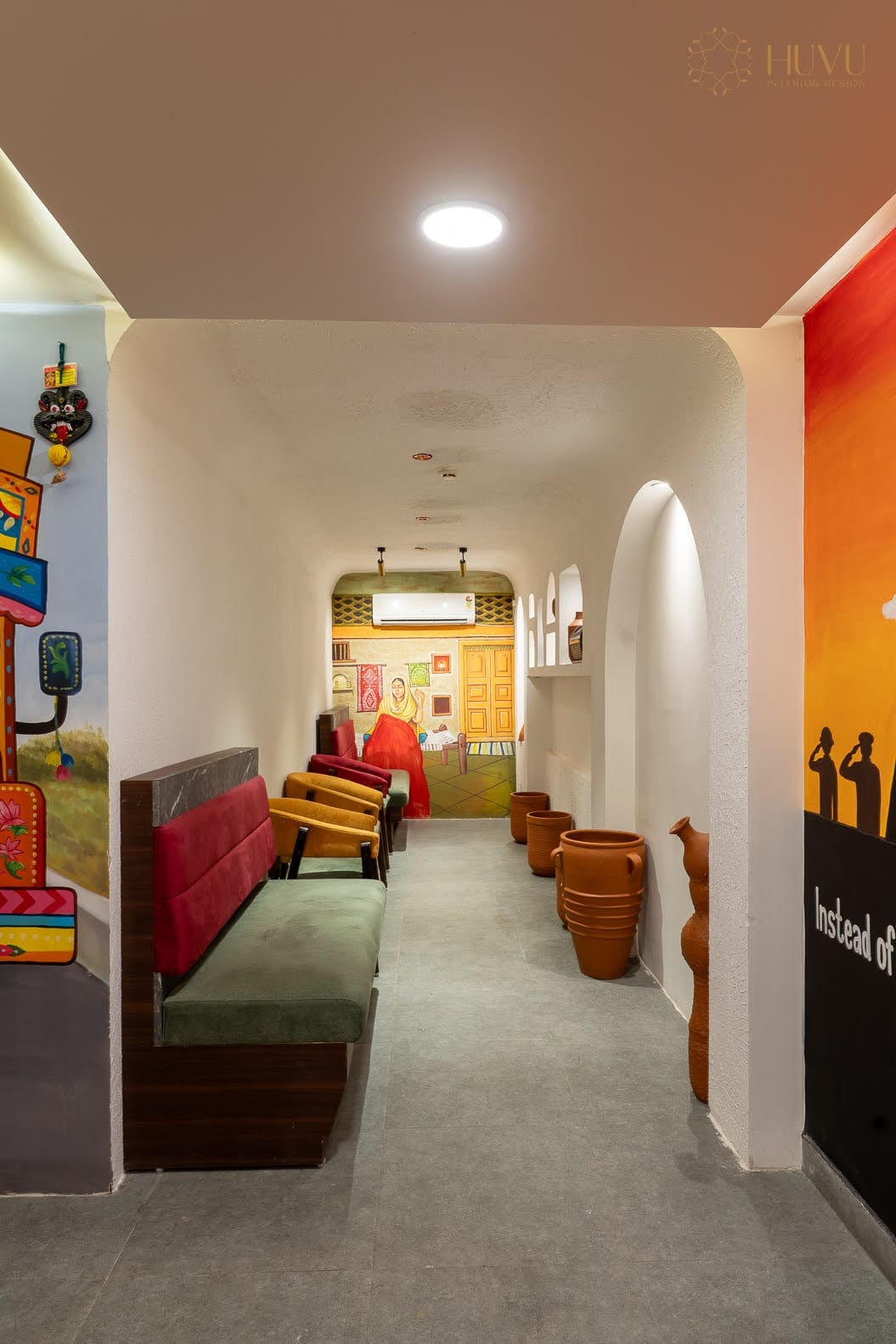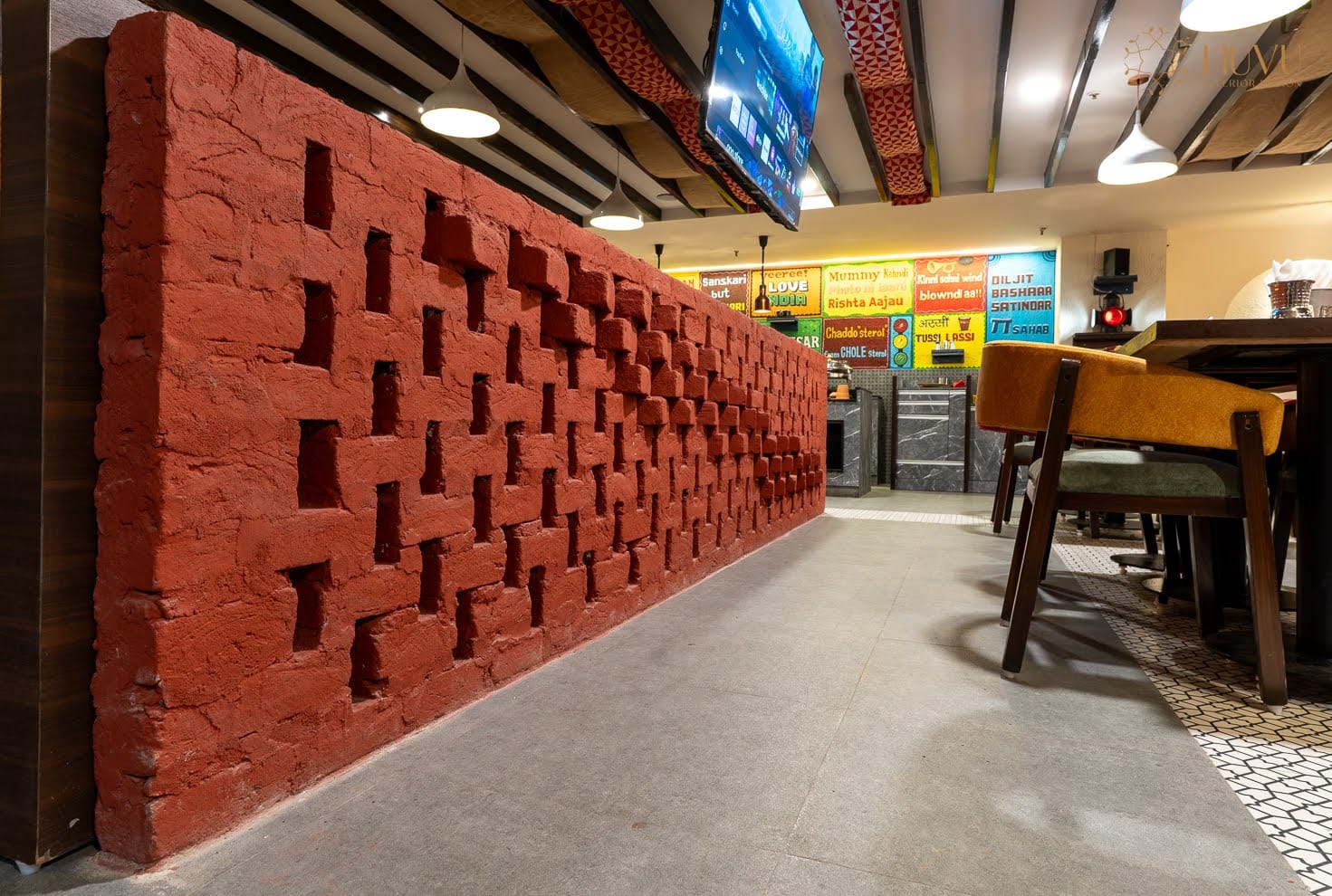 The interiors showcase a harmonious mix of traditional Punjabi elements and contemporary design features. Rich textures, earthy tones, and handcrafted decorative accents were used to highlight the cultural roots of the space. Elements such as rustic wood finishes, patterned tiles, warm lighting, and artistic wall décor help create an environment that feels both nostalgic and modern.